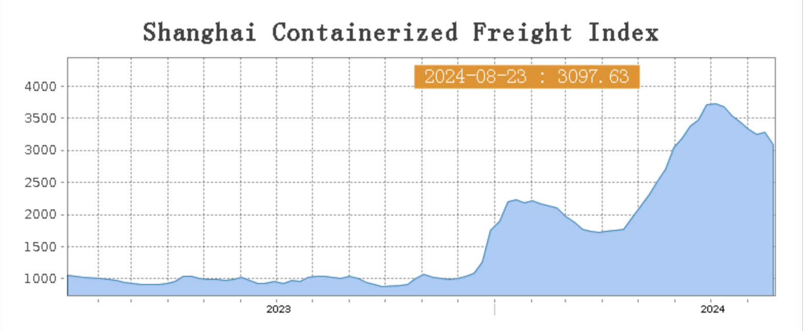 Last week, the Chinese export container shipping market remained generally stable, with freight rates on major ocean routes fluctuating. The composite index experienced slight fluctuations. On 23rd August, the Shanghai Containerized Freight Index dropped by 5.6% to 3097.63.