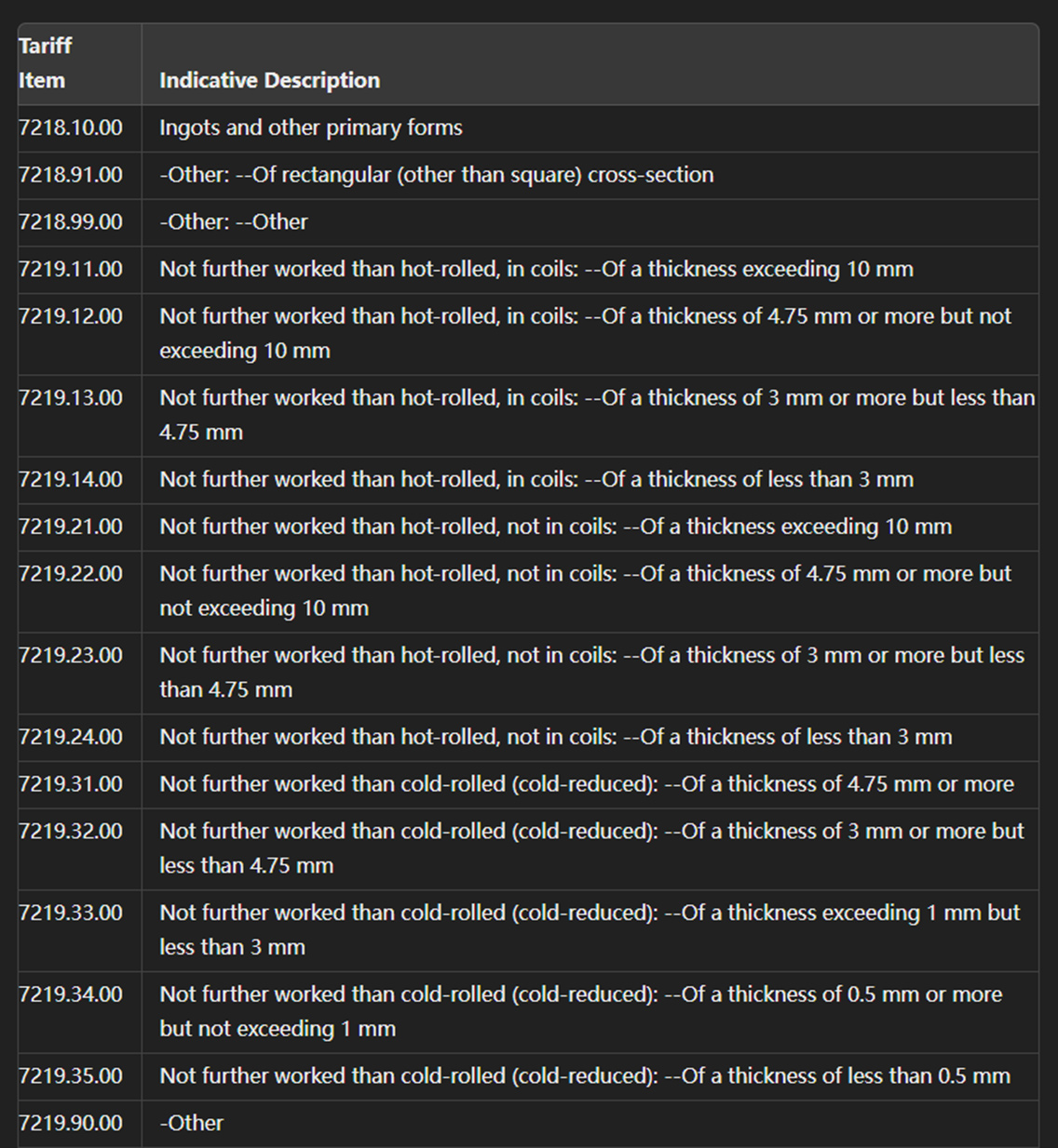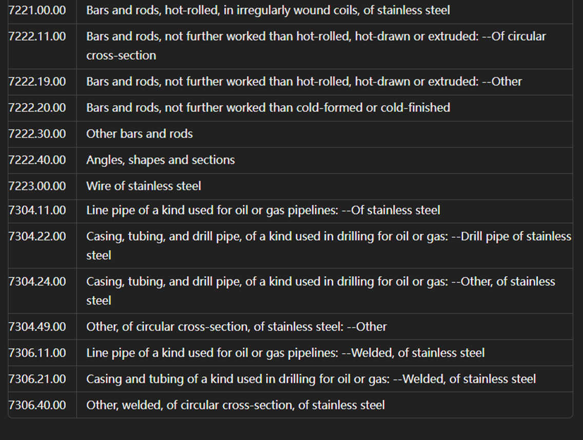 The stainless steel products affected include mainly cold-rolled and hot-rolled sheets, bars, wire rods, angles, sections, special shapes, seamless pipes, and welded pipes, covering the vast majority of stainless steel products. The initial list of stainless steel-related goods subject to the tariffs is as follows.