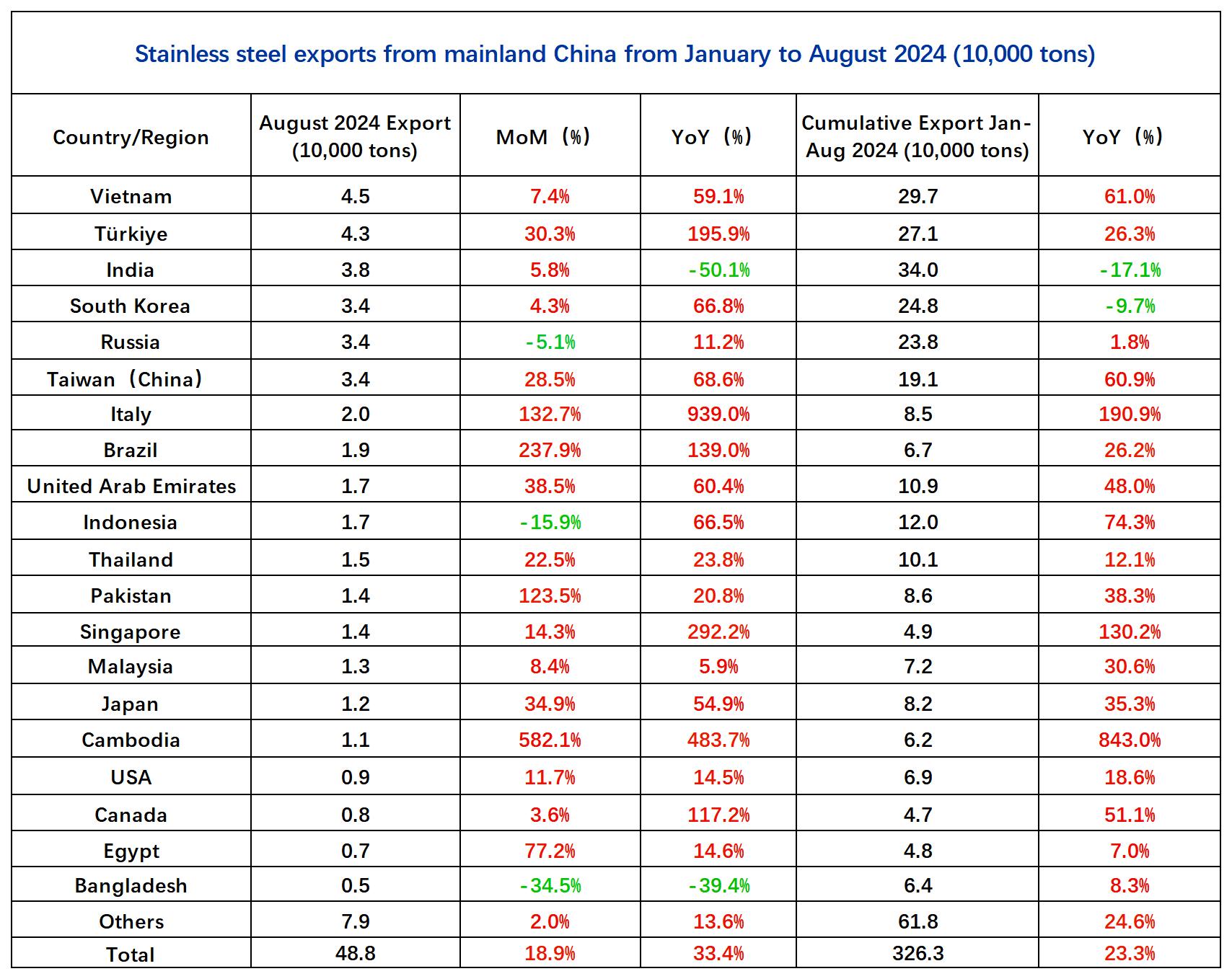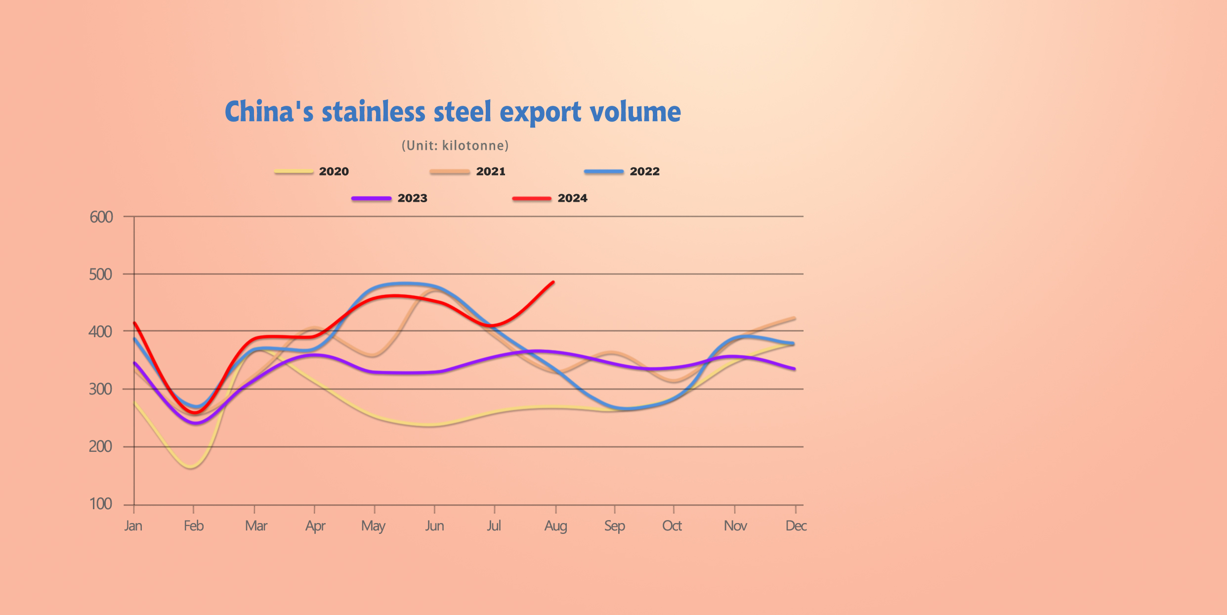 From January to August 2024, China's cumulative stainless steel exports amounted to approximately 3.2633 million tons, a year-on-year increase of 617,700 tons, or 23.3%.