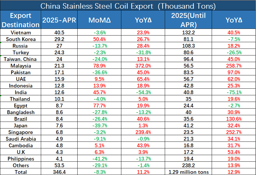In April 2025, the top 10 destination regions for China’s stainless steel coil exports accounted for around 224,700 tons, which is about 64.85% of the total.
