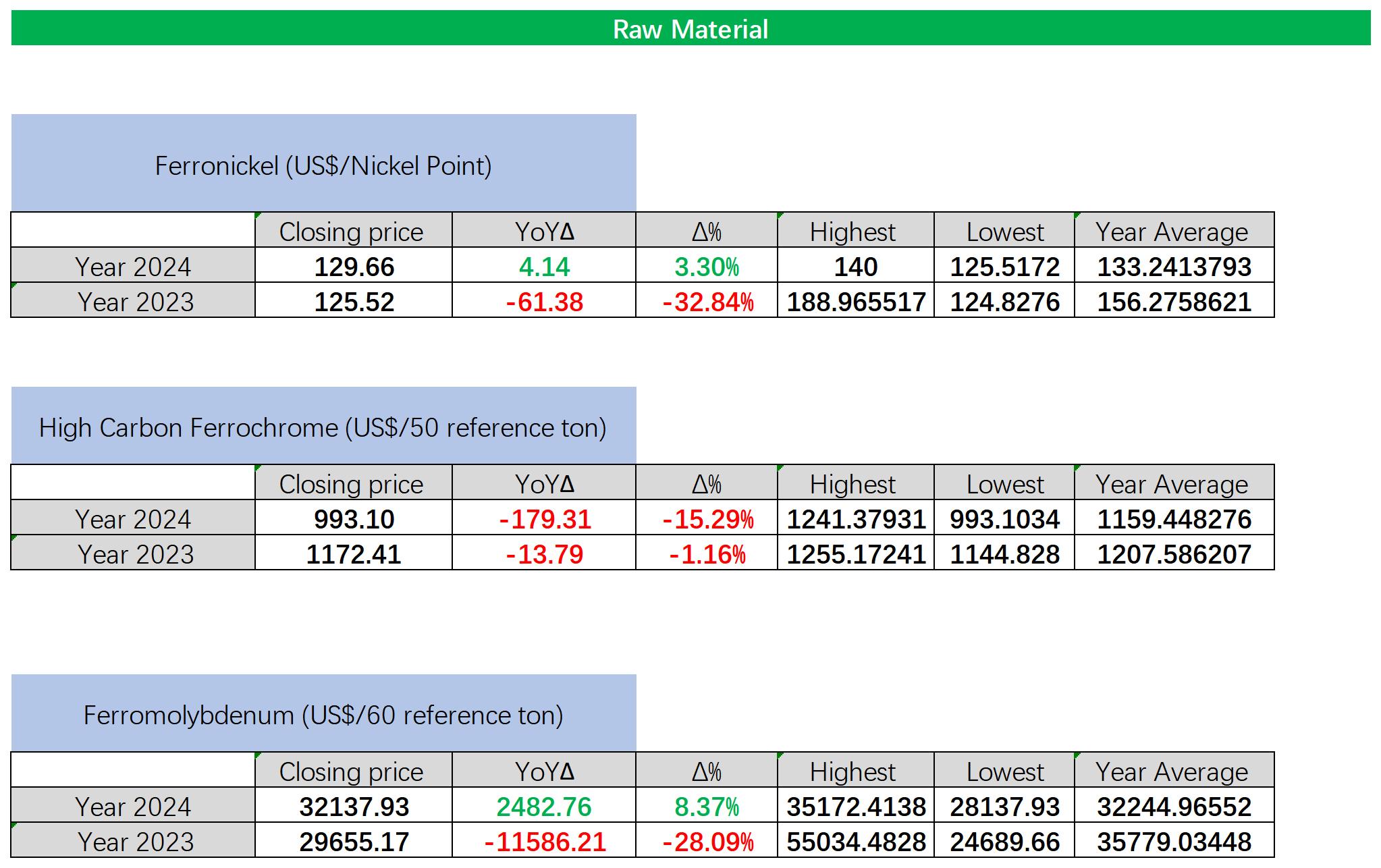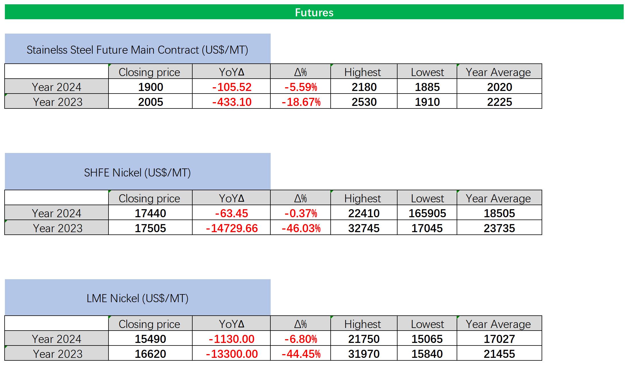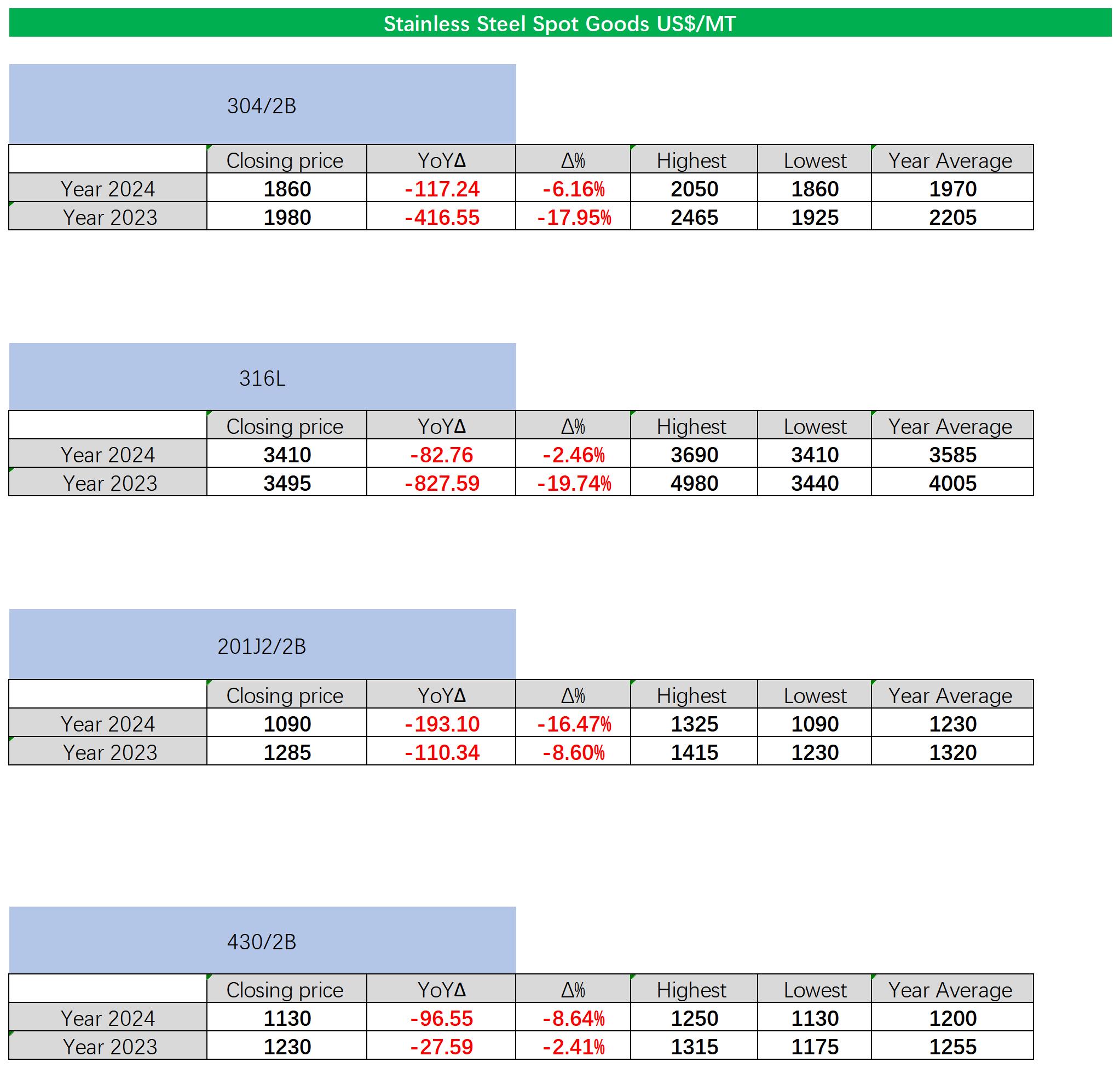 Last week, 304 spot market prices continued to decline. As of Friday, the mainstream base price of cold-rolled four-foot 304 in the Wuxi area was reported at US$1855/MT, and the hot-rolled price was reported at US$1825/MT, both down US$14/MT from last Friday. At the beginning of the week, prices were low, coupled with the release of positive market sentiment, and speculative restocking demand was released, resulting in a slight reduction in inventory. After the New Year's Day holiday, both the stock market and the futures market fell, and investment sentiment once cooled down. There were rumors that regulatory authorities required the short-term release of negative sentiment, the commodity market was under pressure, and stainless steel futures and spot prices continued to fall to new lows. Downstream merchants mostly held orders and waited, and transactions decreased significantly in the second half of the week.