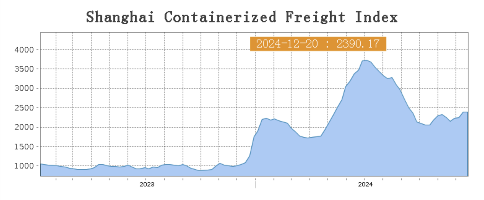On 20th December, the Shanghai Shipping Exchange released the Shanghai Containerized Freight Index (SCFI) at 2390.17 points, up 0.2% from the previous week.