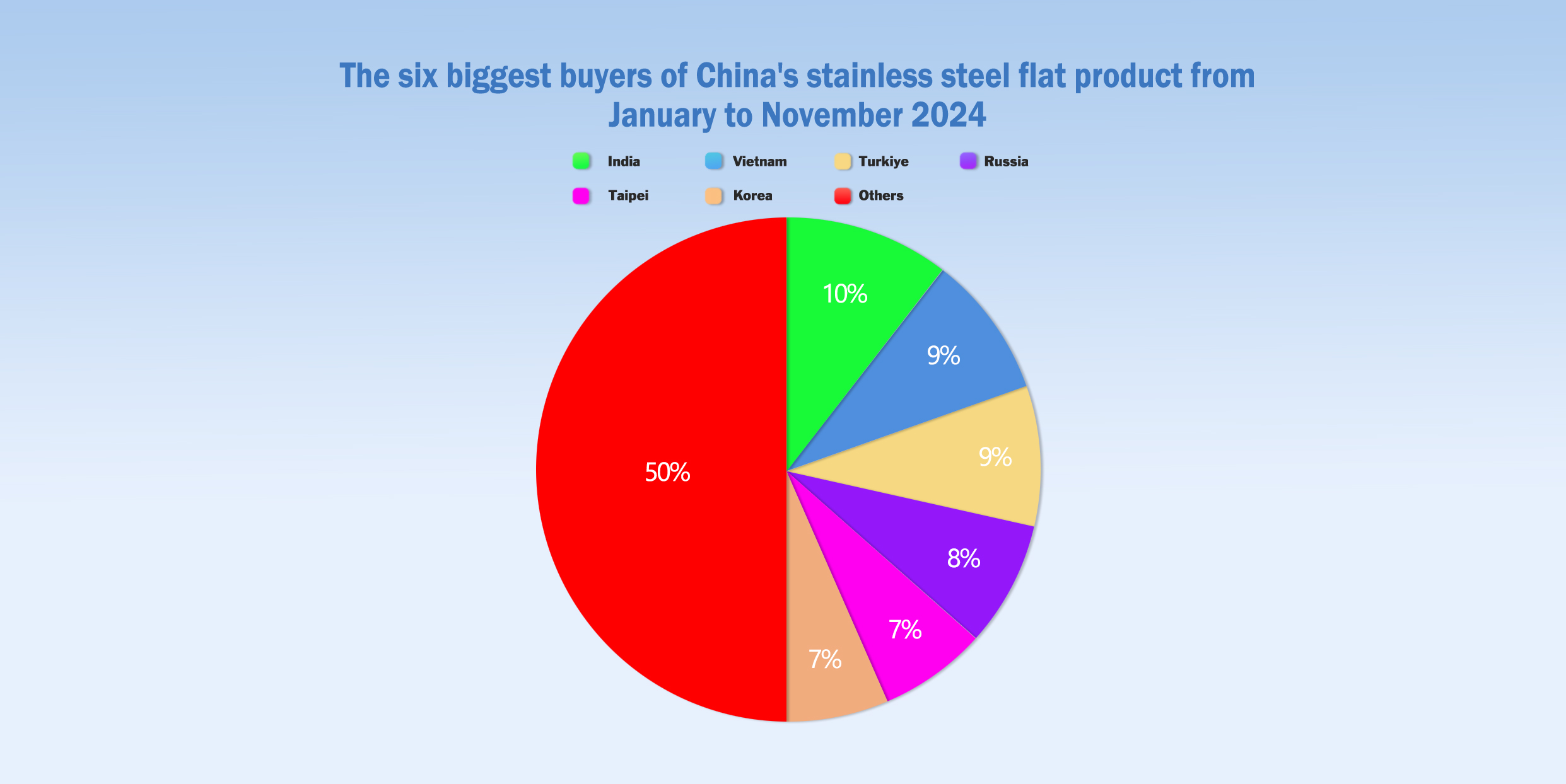 In November 2024, the export volume of stainless steel coil from mainland China to the top ten regions was approximately 206,400 tons, accounting for approximately 61%. From January to November 2024, the cumulative volume was approximately 2,228,200 tons, accounting for approximately 62%.
