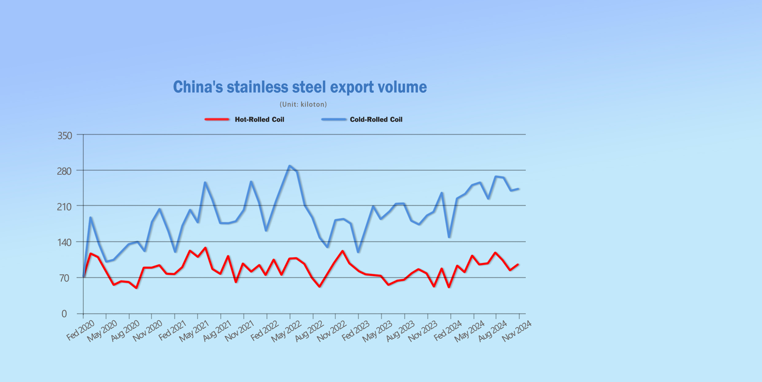 In November 2024, China's domestic stainless steel coil (coil width ≥ 600mm + strip width < 600mm) exports were approximately 338,300 tons, an increase of 4.79% month-on-month and an increase of 26.53% year-on-year.