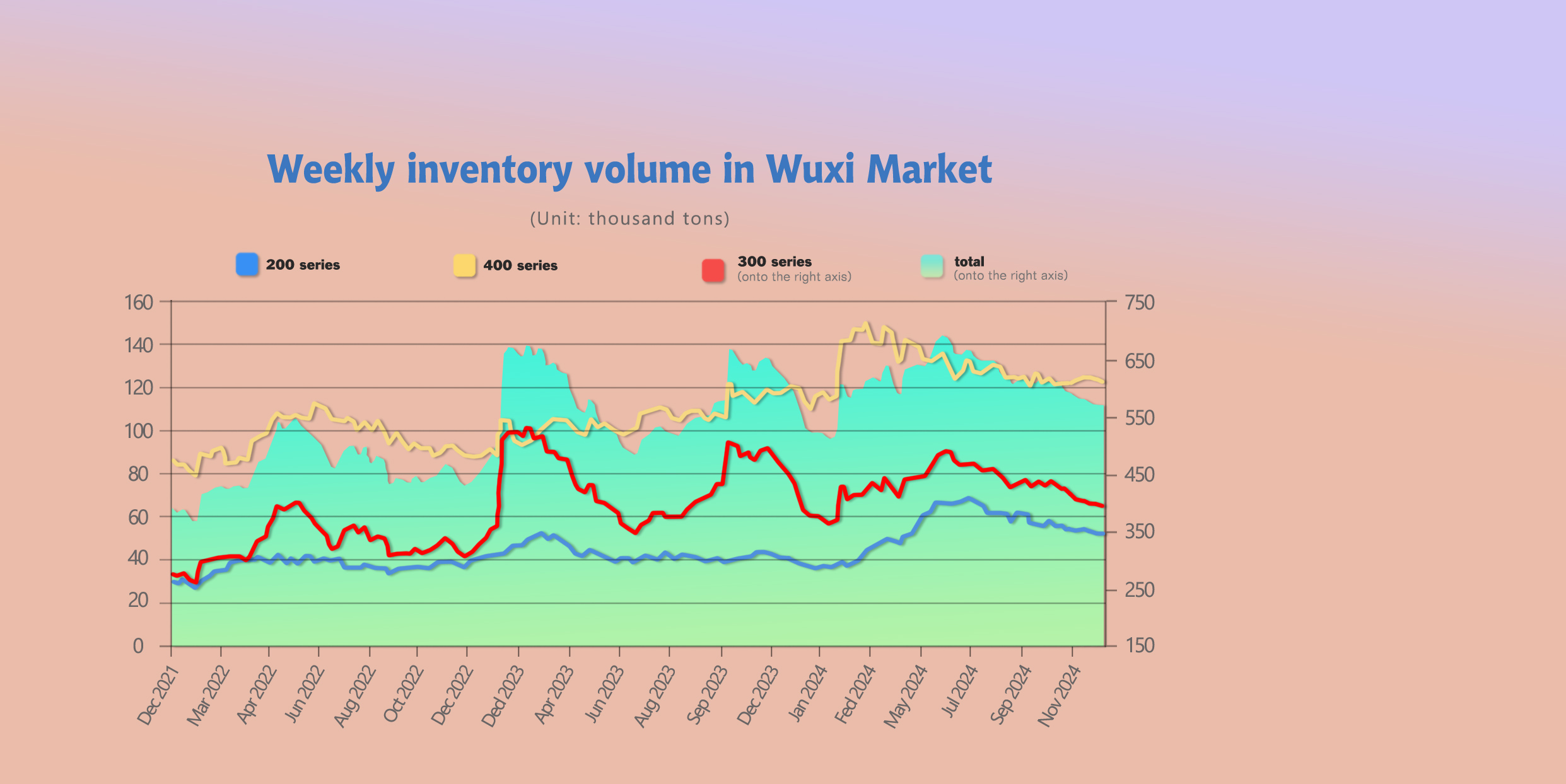 Last week, 304 spot market prices showed mixed ups and downs. As of Friday, the mainstream base price of cold-rolled four-foot 304 in Wuxi area was reported at US$1870/MT, down US$20/MT from last Friday; the hot-rolled price was reported at US$1840/MT, down US$7/MT from last Friday. Last week, the market continued to fall and hit new lows, and the basis difference between futures and spot prices narrowed significantly, resulting in insufficient market confidence. The current off-season demand is weak, market agents mainly lower prices for shipments, but downstream willingness to take goods is poor. The inquiry atmosphere within the week was average, actual transactions were sluggish, and inventory slightly accumulated. On Thursday, the Federal Reserve made hawkish remarks, which are expected to reduce interest rate cut expectations in 2025, and futures and spot prices further declined.