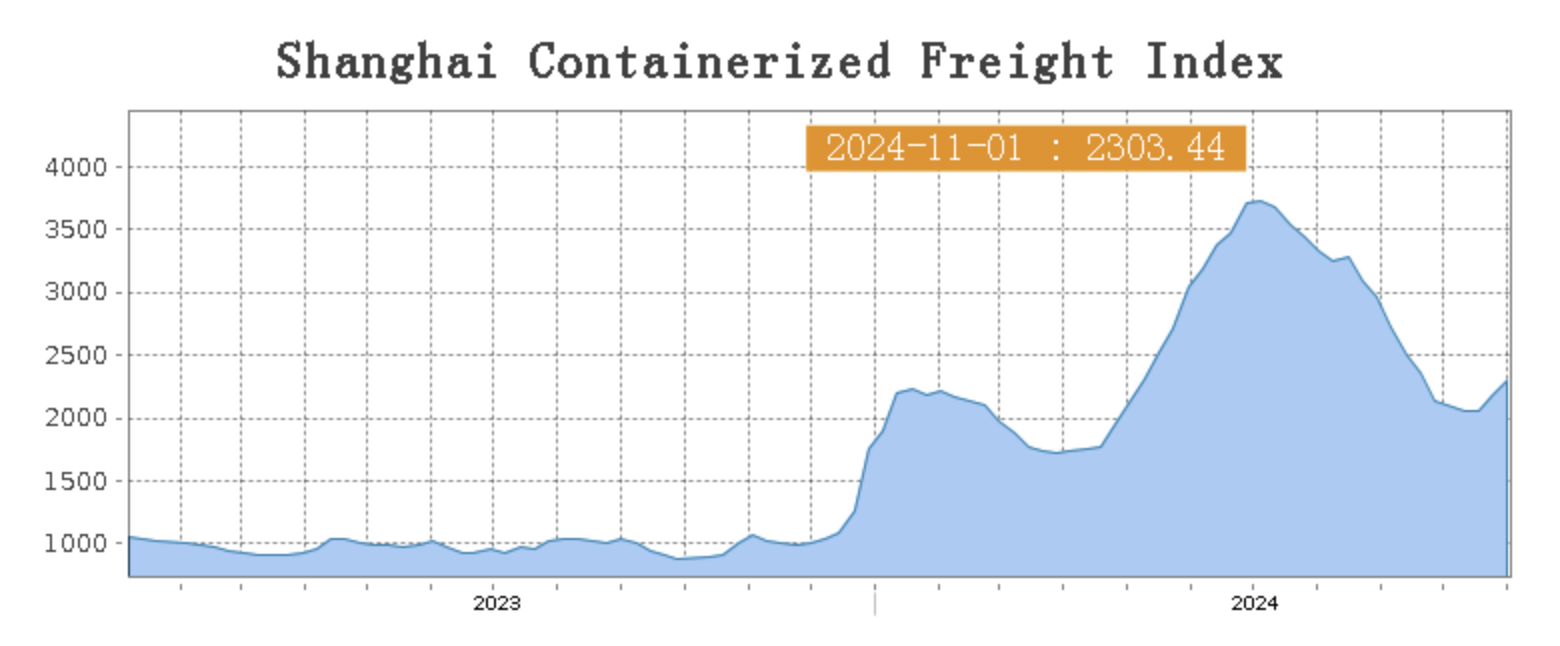 Last week, the Chinese export container transportation market continued to maintain a stable and improving trend, with ocean freight rates continuing to rise, driving the comprehensive index upward. On 1st November, the Shanghai Containerized Freight Index lifted by 5.4% to 2303.44.