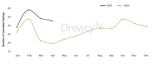 According to Drewry, global east–west trade lanes experienced 198 canceled sailings between March and April—a 46.47% year-on-year increase. From April 15 to May 18, about 44 eastbound trans-Pacific sailings are expected to be cut.