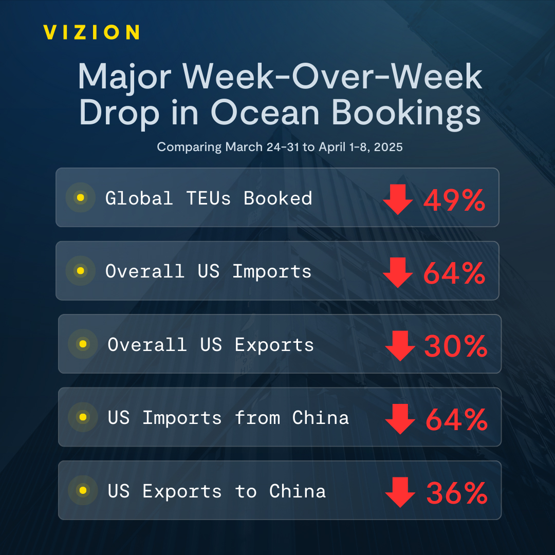 The trade war's impact has been particularly pronounced on the trans-Pacific route. Data from Vizion, a container freight analytics firm, shows that compared to the week of March 24–31, bookings between April 1–8 fell by 49% globally.