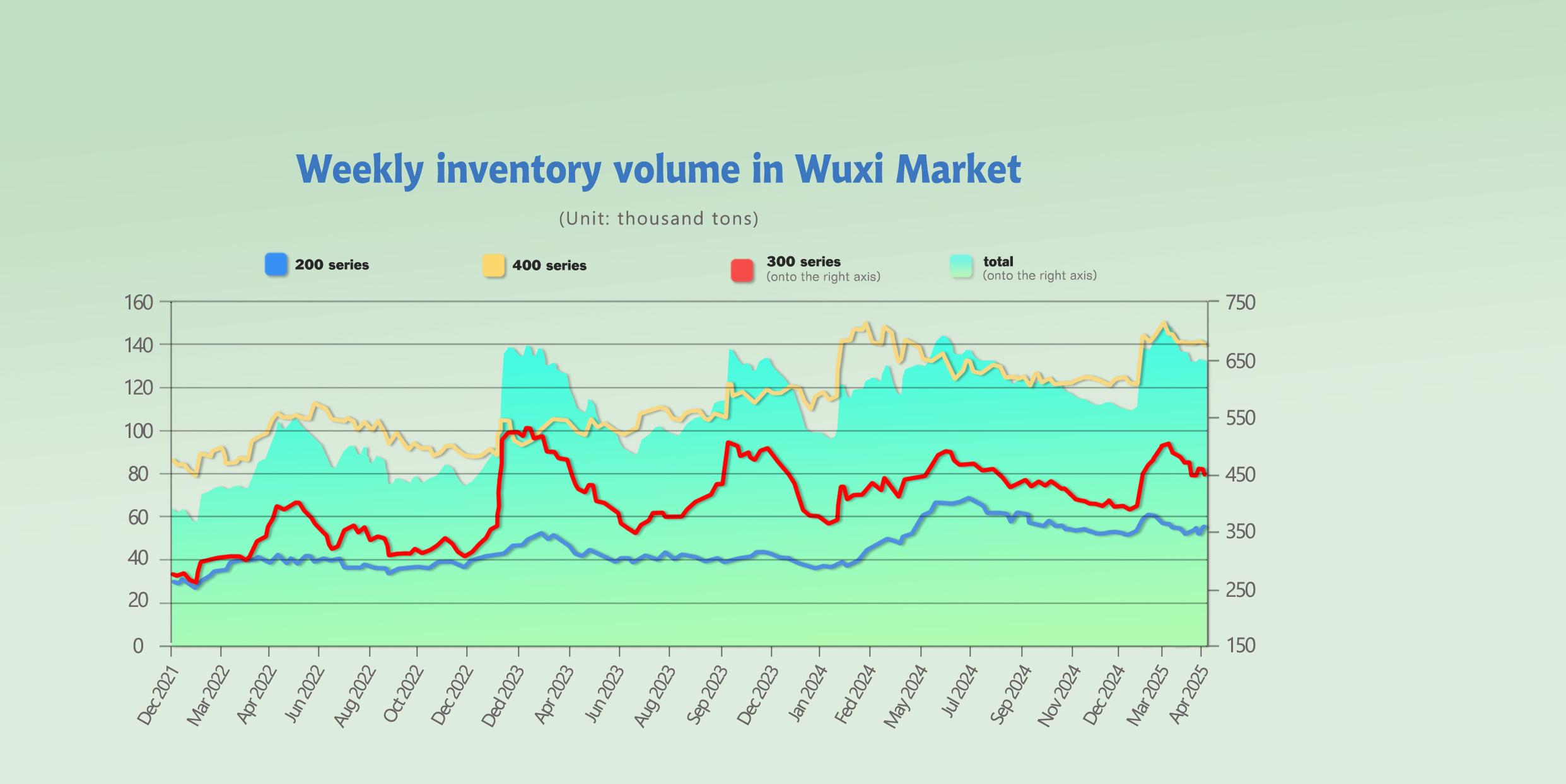 The 304 stainless steel spot market held steady last week. As of Friday, the mainstream base price for privately-produced cold-rolled four-foot 304 coils in Wuxi stood at US$1890/MT, and hot-rolled was quoted at US$1870/MT—both unchanged from previous Friday. Futures prices fluctuated within a stable range. The impact of tariff policy escalations eased, and China’s Q1 GDP data showed strong performance, improving overall market sentiment. As macroeconomic expectations improved, low-priced inventories saw better movement, resulting in a slight reduction in stock levels.