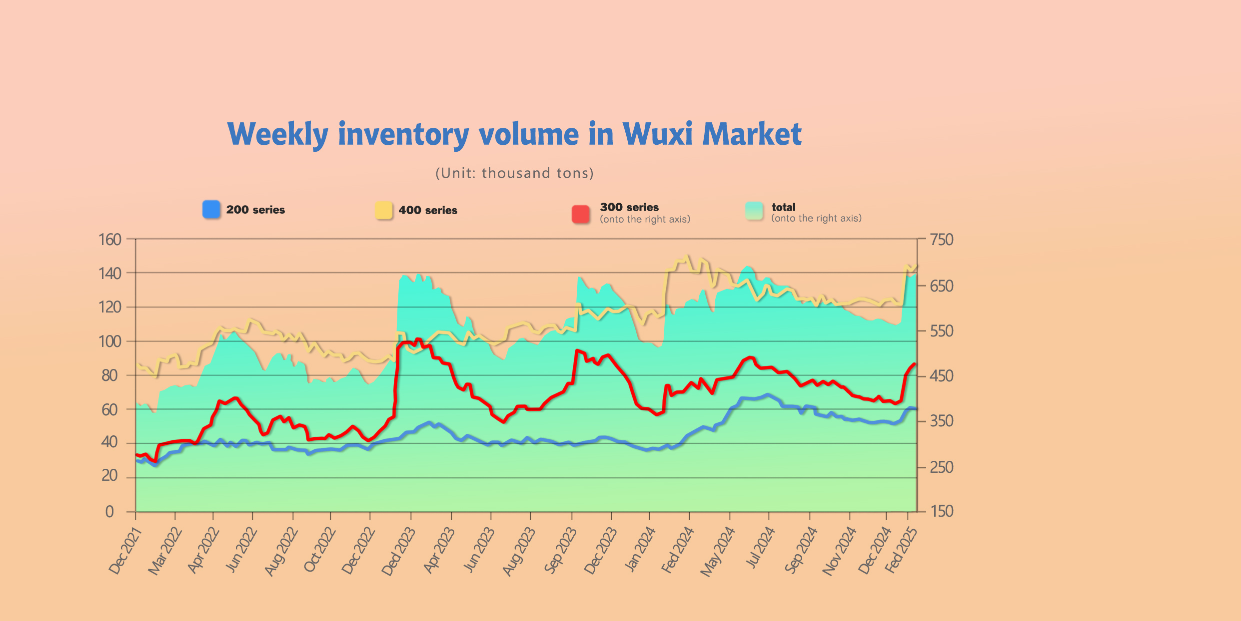 As of February 20th, total inventory in Wuxi sample warehouses increased by 14,100 tons to 681,100 tons. Breakdown: