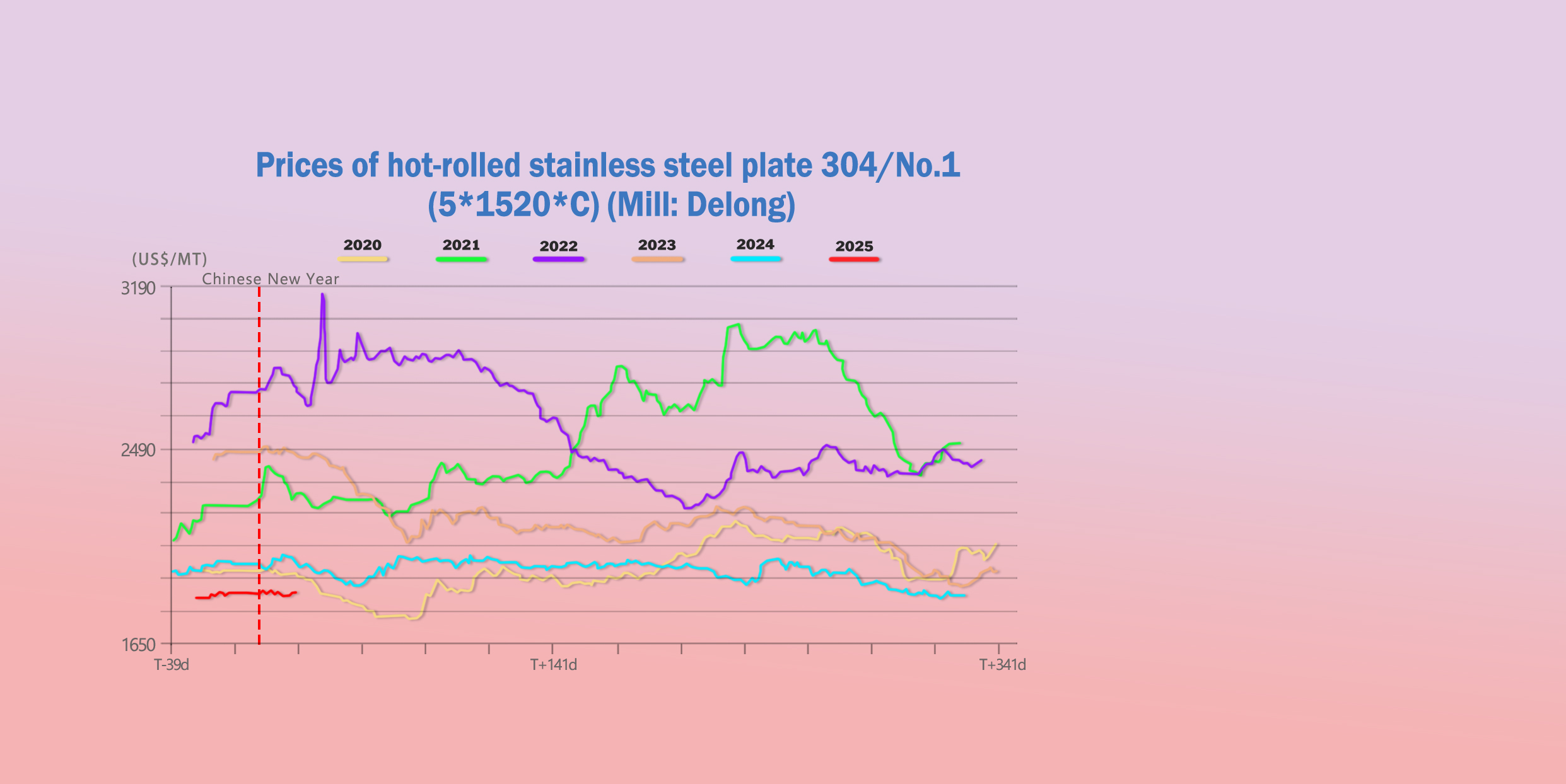As of February 21, 2025, prices for 304 cold/hot-rolled, 201 cold/hot-rolled, and 430 cold/hot-rolled in Wuxi are at their lowest levels in six years. In 2024, prices trended downward due to oversupply and weak raw material costs, with only a brief uptick in October.
