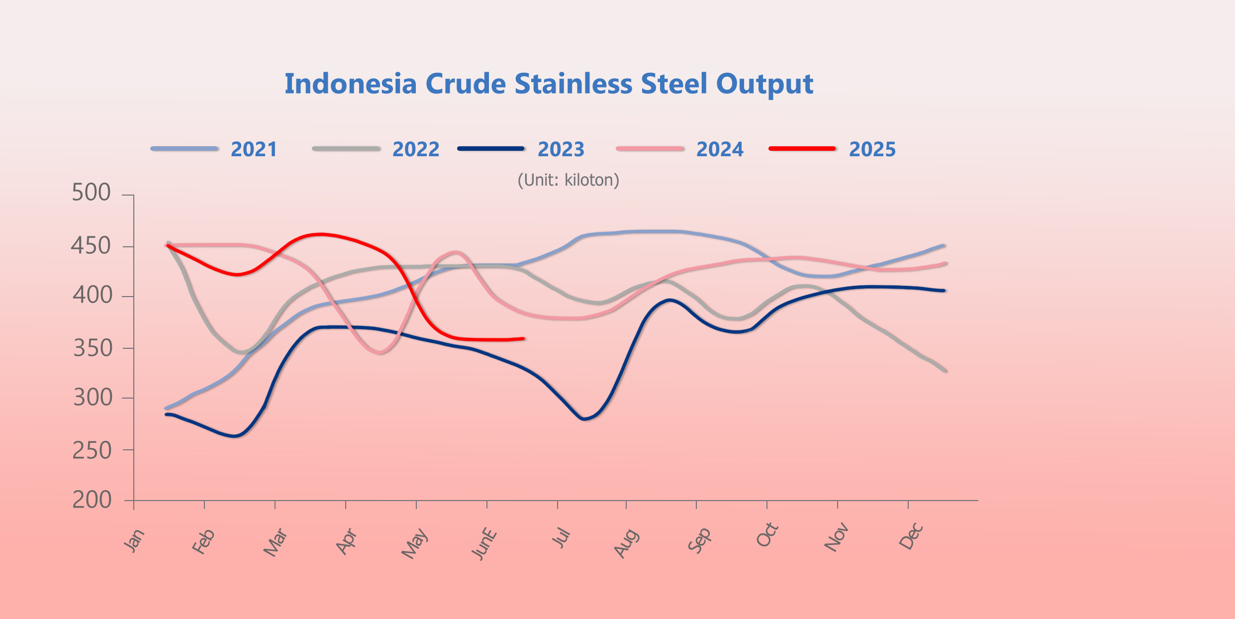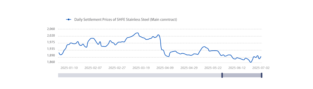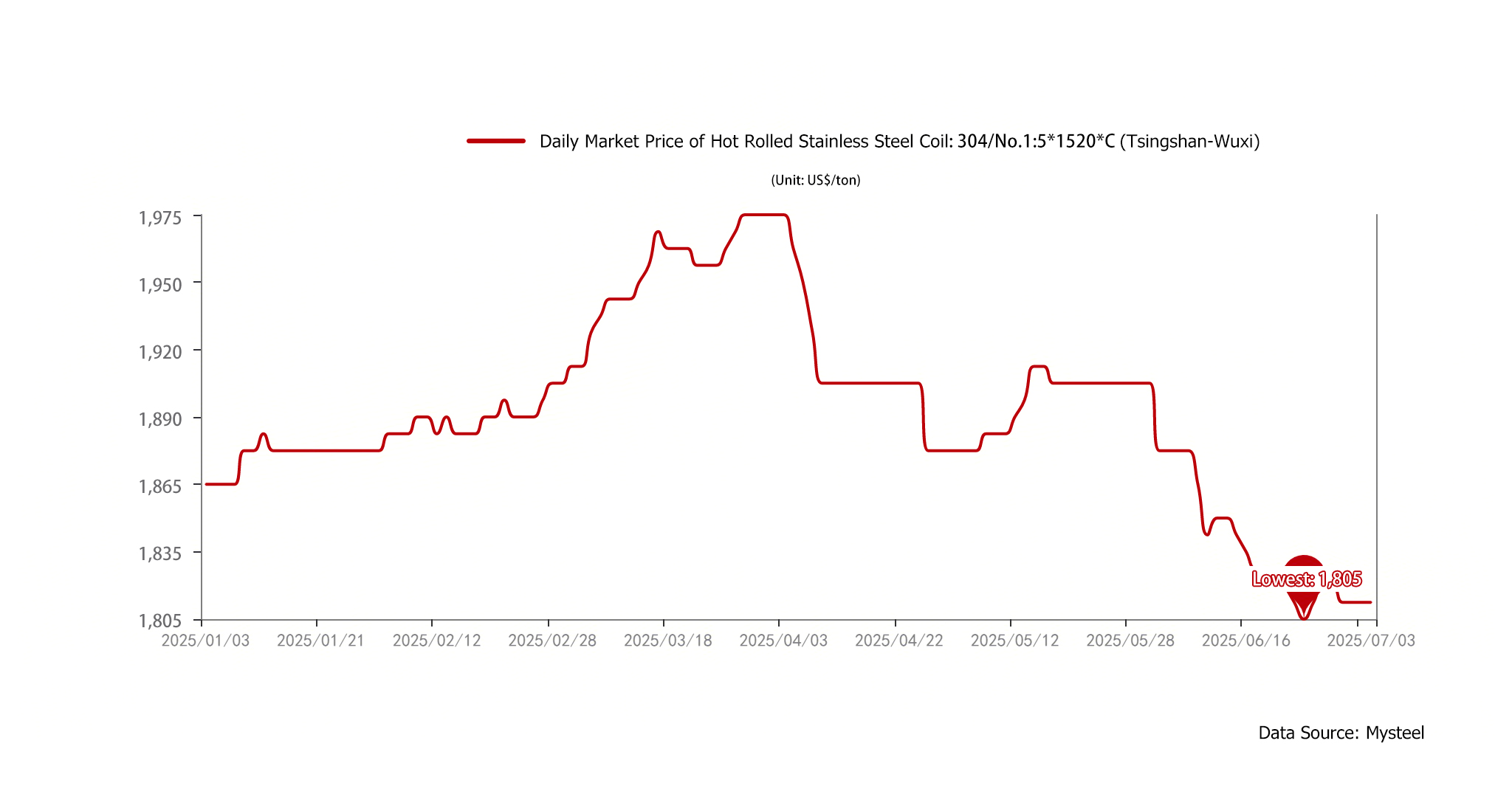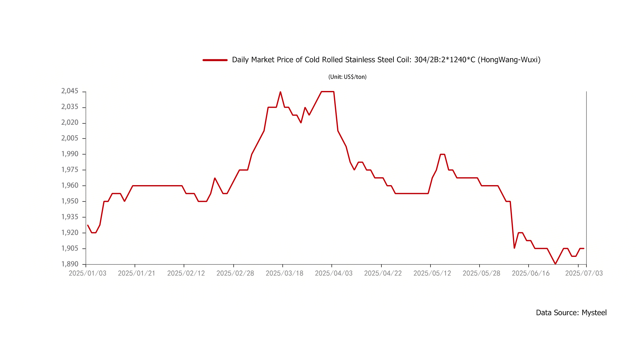 The settlement price of the stainless steel main contract on the Shanghai Futures Exchange rose from US$1800/MT in early January to US$1917/MT in mid-March (the year’s peak). However, starting in April, prices plunged under pressure from U.S. tariff policies, falling to US$1741/MT on June 24 (the year’s low), a decline of 9.2%.