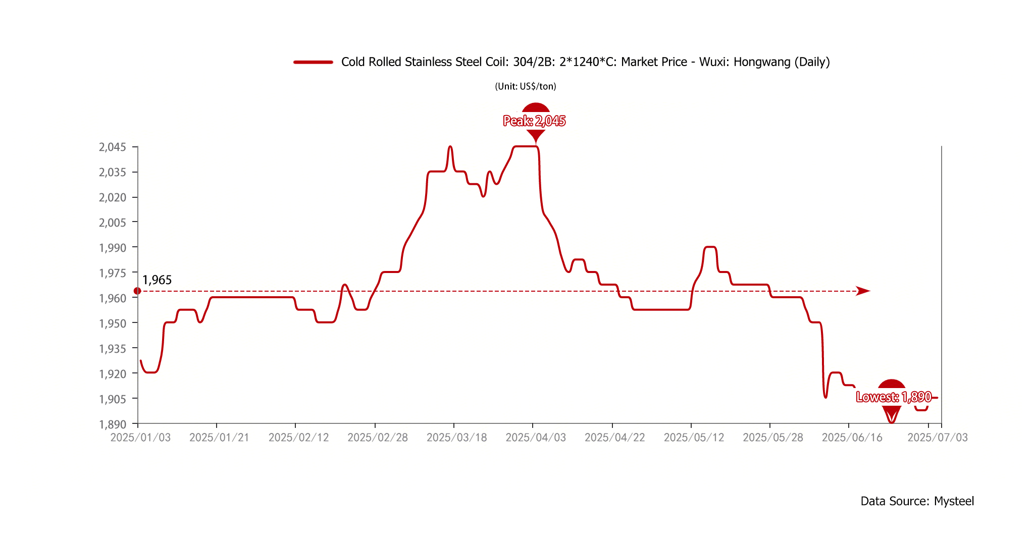 In the first half of 2025, the stainless steel market followed a trajectory of rising first and then falling (using Wuxi market 304 cold-rolled Hongwang as an example). Prices initially trended upward, supported by macro policies and cost factors, peaking in March. However, in Q2, prices declined continuously due to weak demand, high inventory levels, and falling raw material costs.