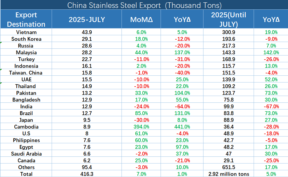 As the largest destination for China’s stainless steel exports, Vietnam’s performance has drawn close attention. Since Vietnam removed its anti-dumping measures on Chinese cold-rolled stainless steel in November 2024, exports from China to Vietnam have risen significantly, making Vietnam the top export destination for Chinese stainless steel. In July 2025, China’s stainless steel exports to Vietnam reached around 43,900 tons, up 2,500 tons month-on-month, an increase of 6%; and up 2,100 tons year-on-year, an increase of 5%. From January to July 2025, cumulative exports to Vietnam amounted to around 300,900 tons, up 57,100 tons year-on-year, an increase of 19%.