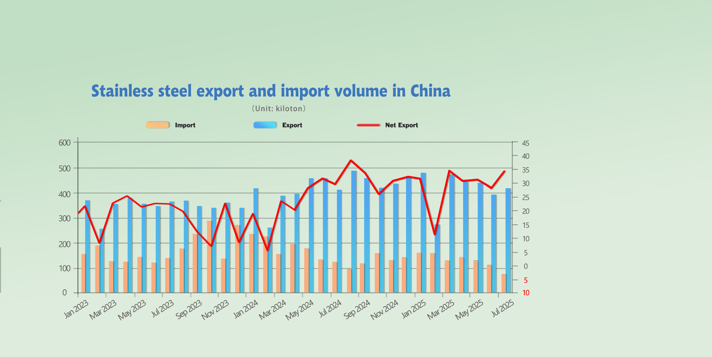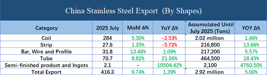 In July, China’s stainless steel exports reached 416,300 tons, up 6.76% month-on-month and 1.40% year-on-year. From January to July, cumulative exports totaled 2.9163 million tons, an increase of 5.08% compared with the same period last year.