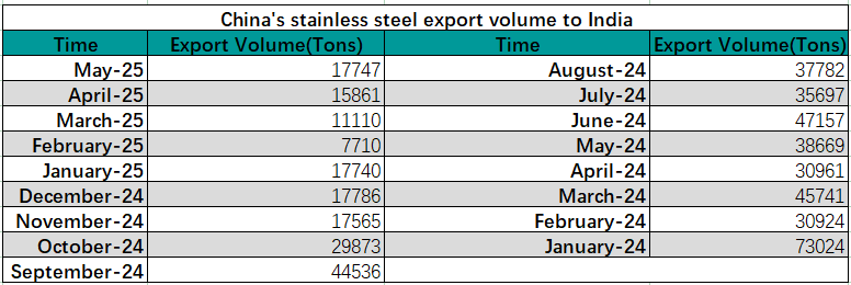 According to Chinese customs data, China’s stainless steel exports to India reached a record monthly high of 73,024 tons in January 2024. However, volumes have since come under sustained pressure, falling sharply to just 17,747 tons in May 2025—a 54% plunge compared to May 2024 (38,669 tons), far exceeding the range of normal market fluctuations.