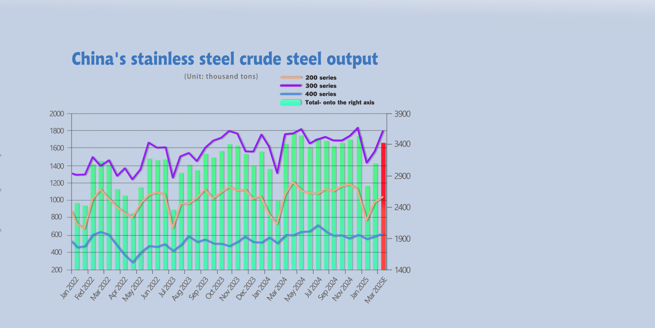 Steel mills production scheduling for March continues to increase. According to preliminary statistics, the domestic stainless steel crude steel scheduled output in March 2025 will increase by 330,000 tons from the previous month to around 3.43 million tons, of which the scheduled output of the 300 series will increase by 240,000 tons from the previous month to 1.8 million tons, the scheduled output of the 200 series will increase by 60,000 tons from the previous month to 1.03 million tons, and the scheduled output of the 400 series will increase by 40,000 tons from the previous month to 610,000 tons.