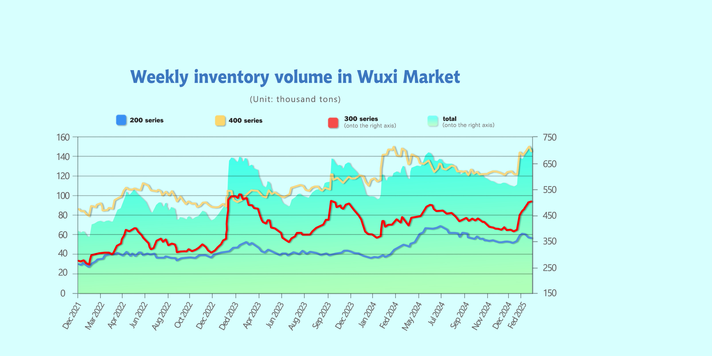 200 Series: The market continues to strengthen, and macro policy expectations have boosted market confidence. Beigang New Materials has a maintenance plan from March to June, the output of 200 series crude steel has decreased, and market supply pressure has weakened. In addition, raw material copper has rebounded from a low level, and the cost support has become stronger. Downstream demand is gradually recovering, and 201J2 cold-rolled prices are expected to maintain a stable to strong run in the short term.