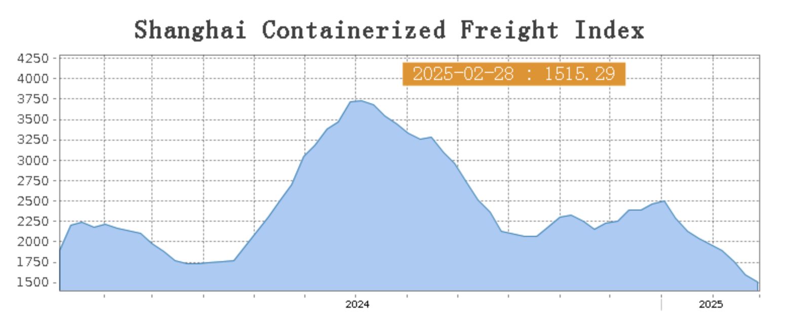 On February 28th, the Shanghai Containerized Freight Index (SCFI) fell 5% to 1515.29 points.