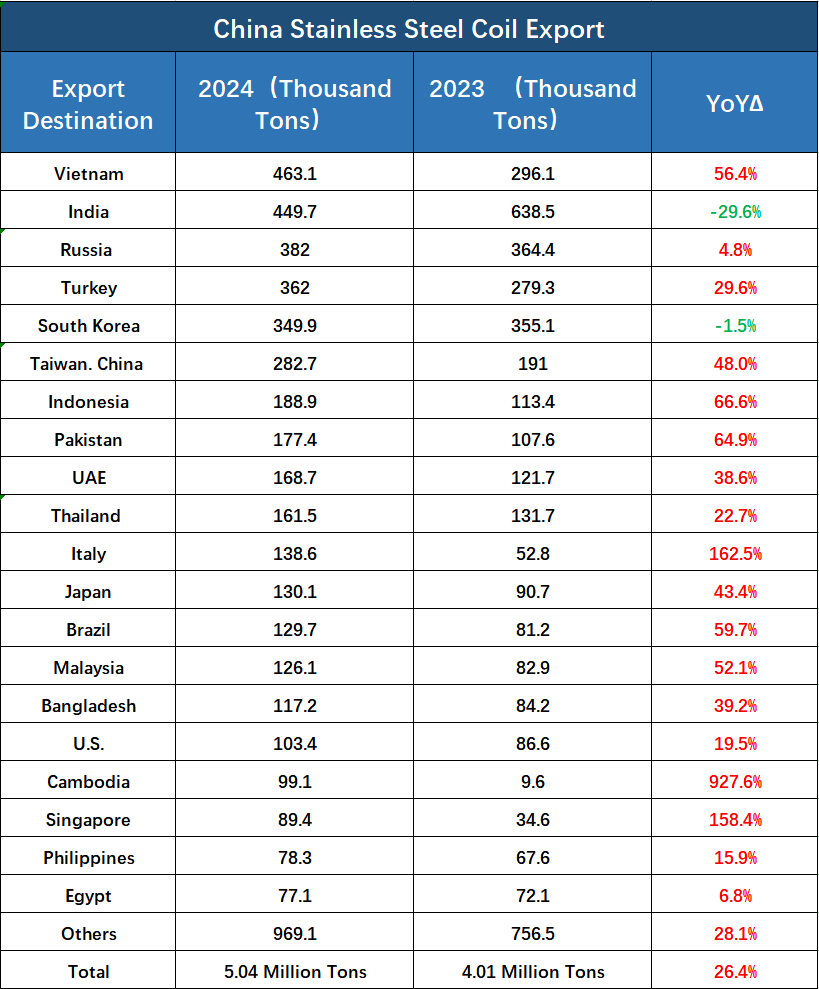 In 2024, China’s stainless steel exports surged, with notable growth to Vietnam (+167,000 tons, up 56.4%).