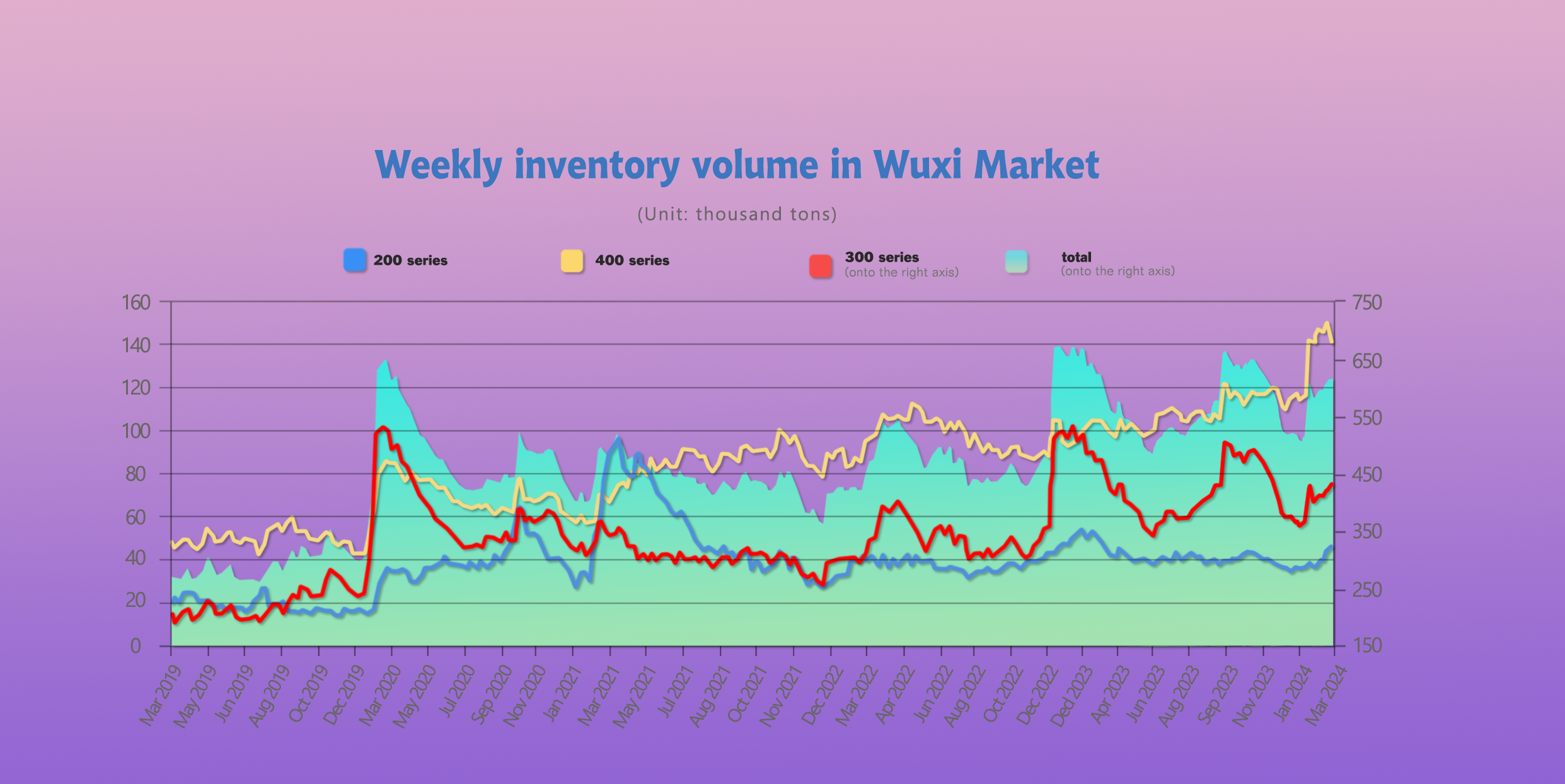The total inventory at the Wuxi sample warehouse increased by 2,596 tons to 519,546 tons (as of 28th March).