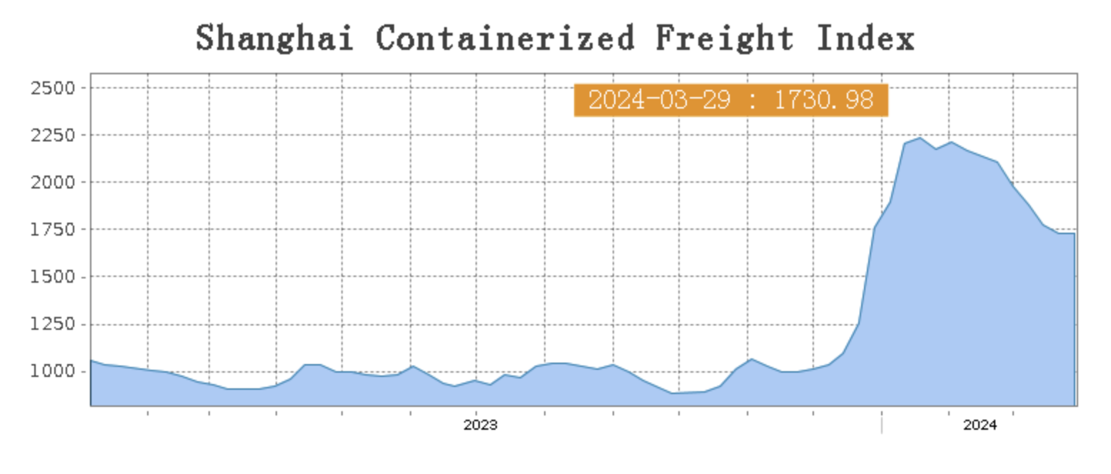 China’s Containerized Freight market continued to be interrupted by the regional fluctuation. On 29th March, the Shanghai Containerized Freight Index fell by 0.1% to 1730.98.