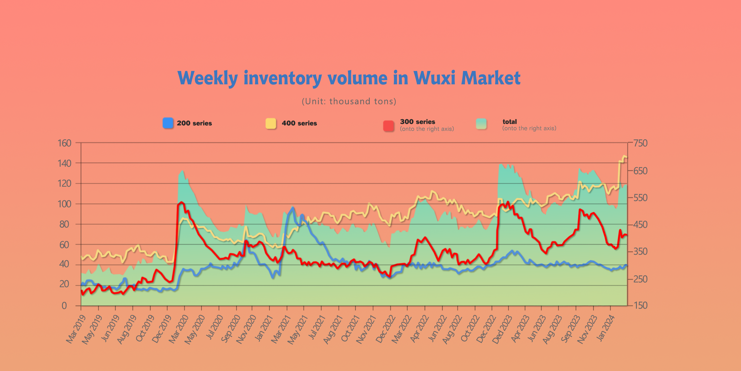 Last week, the total inventory of sample warehouses in Wuxi increased by 0.01 million tons to 592,800 tons compared to the previous period. Among them, the inventory of the 200 series increased by 0.16 million tons to 39,400 tons, with increases in both cold-rolled and hot-rolled. The March production plan of steel plants increased significantly month-on-month last week, leading to an increase in market arrivals. In addition, Qing Shan and Hongwang have lifted price limit policies, resulting in a decline in 201 prices, and downstream customers purchased according to demand, resulting in inventory accumulation.
