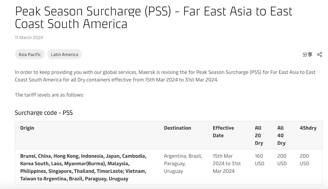 Maersk is adjusting Peak Season Surcharge (PSS) rates for selected routes effective March 1st to 31st March 2024, to ensure continued global service provision.