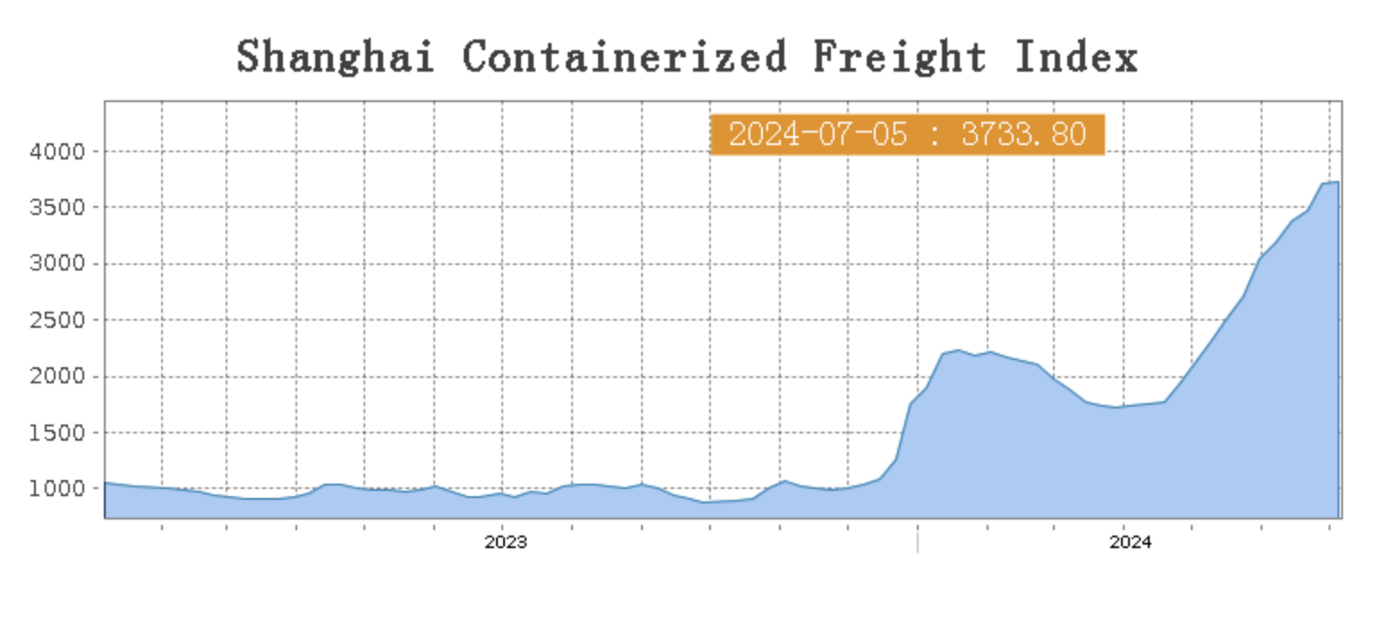 According to data released by the Institute for Supply Management (ISM), the US ISM non-manufacturing index for June was 48.8, which was significantly lower than market expectations and fell below the critical line. The contraction of service sector activities is at its fastest pace in four years, mainly due to the sharp decline in business activities and order declines. Against the backdrop of long-term high interest rates, the future economic outlook for the United States is not optimistic. Last week , transportation demand remains high, the supply and demand fundamentals are solid, and market freight rates continue to rise. On 5th July, the freight rates (shipping and shipping surcharges) for exports from Shanghai Port to the US West and US East major ports were US$8103/FEU and US$9945/FEU, reporting a 3.5% and 7.2% lift accordingly.
