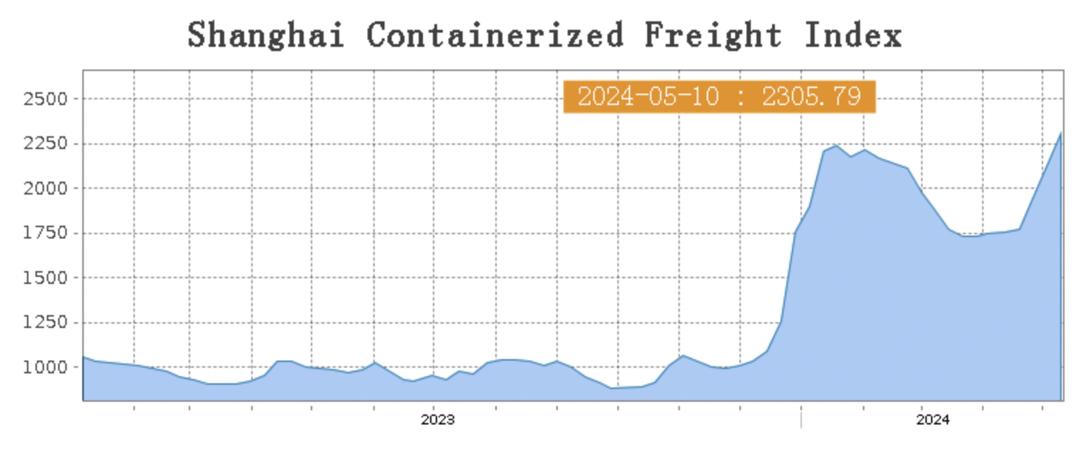 This week, the China export container shipping market continued its good performance after the short holiday, with ocean route freight rates continuing to rise, driving up the composite index. On May 10th, the Shanghai Shipping Exchange's Shanghai Export Container Comprehensive Freight Index was 2305.79 points, up 18.8% from the previous period.