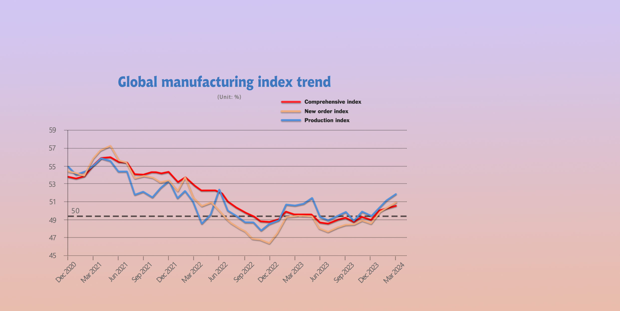 The comprehensive index of global manufacturing industry in the first 3 months of 2024 was 50, 50.3 and 50.6 respectively, ending the long-term trend below 50 since September 2022 and showing continuous growth throughout the first quarter. From the perspective of sub-indices, the production index jumped above 50 in January and kept rising afterwards; the new order index recovered to above 50 in February with a slight lag, staying above the boom-or-bust line for two consecutive months.