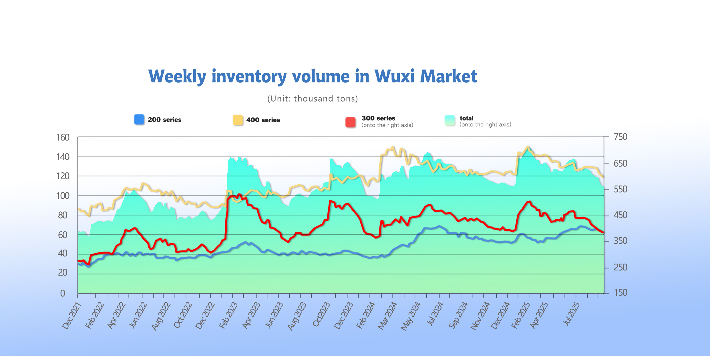 As of September 11, total inventories in Wuxi sample warehouses decreased by 3,700 tons from the previous week to 549,800 tons. By series: 200-series stocks declined 2,100 tons to 60,500 tons; 300-series stocks increased 4,100 tons to 380,700 tons; 400-series stocks decreased 5,800 tons to 108,600 tons.
